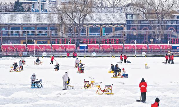 公园的冰场、雪场也格外热闹。在玉渊潭公园冰场,人们划着冰车、骑着冰上自行车,在冰面上穿梭嬉戏。这样的美景怎能不记录留念?大家漫步公园里,或驻足拍照定格雪景,或携亲伴友在雪地嬉戏玩耍,尽享冬日乐趣。